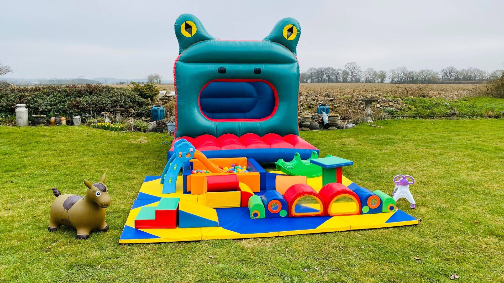 3m x 4.8m of matting, large ball pool + large slide, soft climber, rockers, soft play shapes plus x4 age appropriate ride-ons and hoppers.