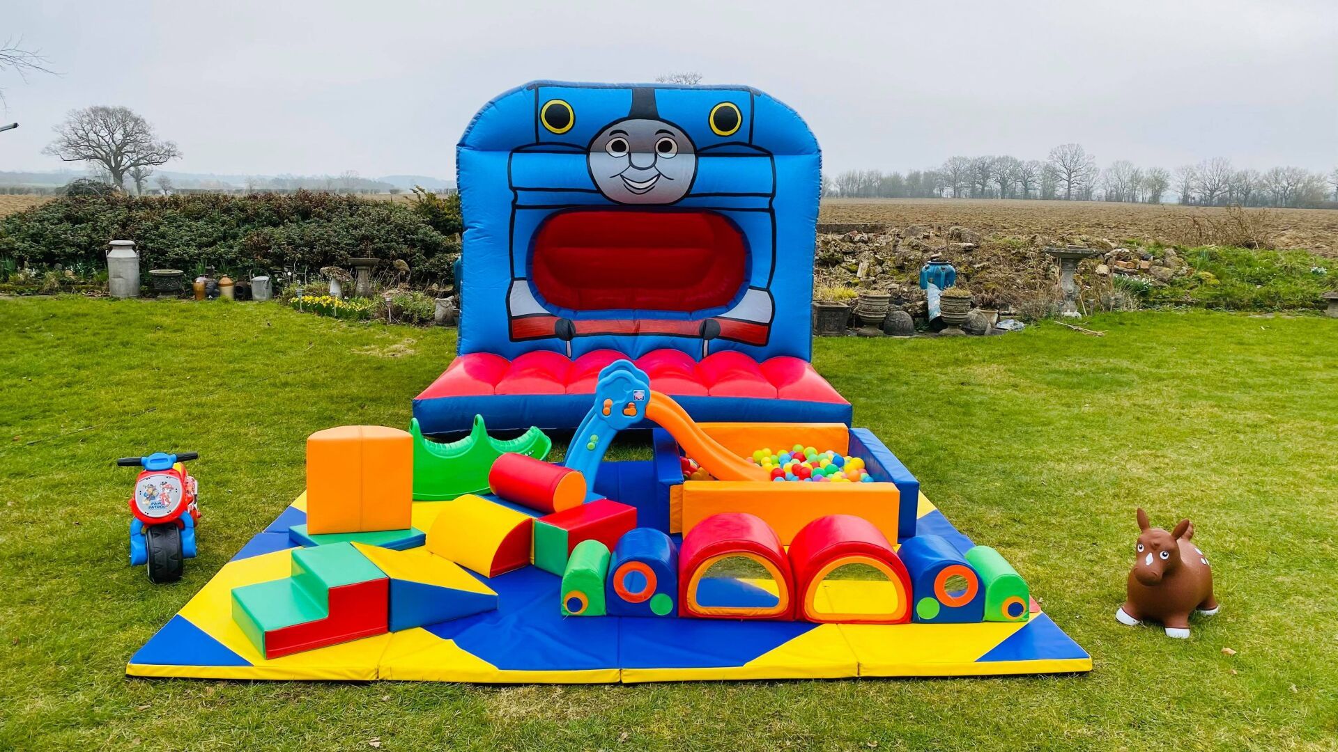 3m x 4.8m of matting, large ball pool + large slide, soft climber, rockers, soft play shapes plus x4 age appropriate ride-ons and hoppers.